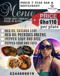 Open 8AM – 12AM ( Tue to Sat). Best Liberian Restaurant in Accra – Ghana. Buka / mama put joint. Also has a bar and lounge for your relaxation with music and sports TV, host your events here too.